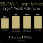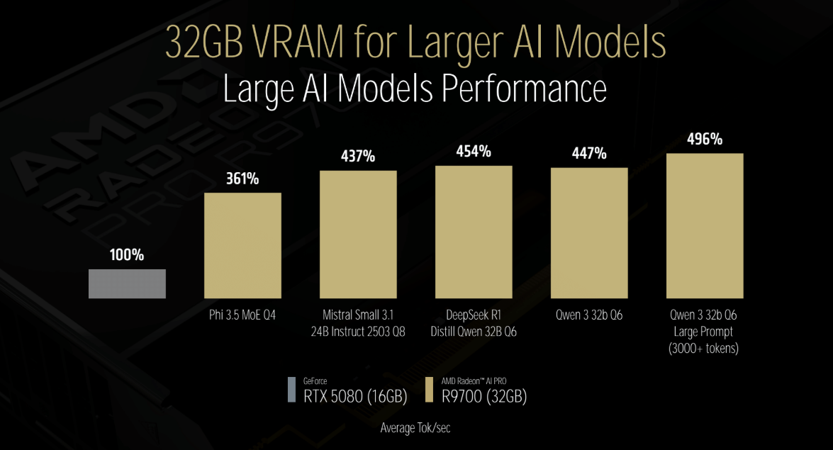 The new R9700 aims to provide 2X better AI performance compared to the previous generation Radeon PRO W7800. In one of the slides, we can see a massive performance improvement across a variety of large AI models. The card promises up to 96TFLOPS of peak half-precision performance, 32GB of GDDR6 memory, 128 AI Accelerators and a 300W TDP.