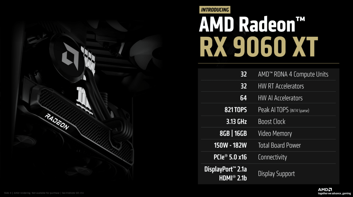 The Radeon RX 9060 XT is a new mid-range gaming graphics card packing 32 RDNA 4 Compute Units, 32 HW RT Accelerators and 64 HW AI Accelerators.