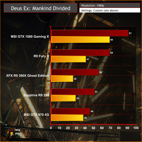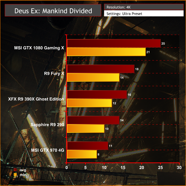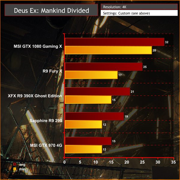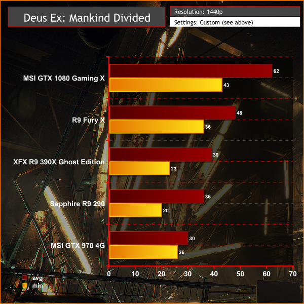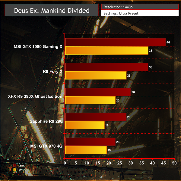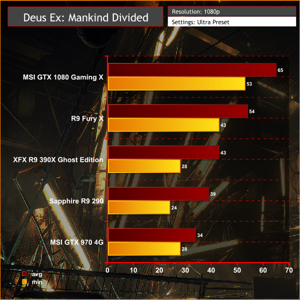 Today, I will be benchmarking Deus Ex: Mankind Divided on a system featuring an Intel Core i7 6700K, 16GB of G.Skill DDR4 RAM, a 1TB Samsung EVO SSD and an Asus Maximus VIII Hero motherboard. For graphics cards, I will be using an MSI GTX 1080 Gaming X, an MSI GTX 970 4G, a Sapphire R9 290 Vapor-X, an XFX R9 390X Ghost Edition and an R9 Fury X. None of the cards are overclocked in our tests.