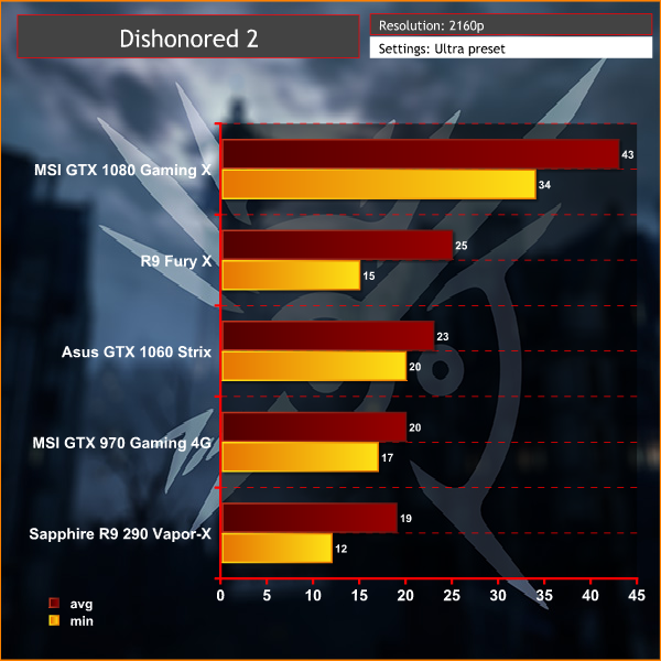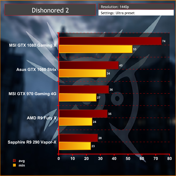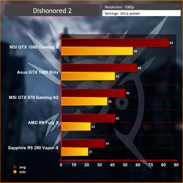 All of the graphics cards included in this test were run with the latest drivers installed. In Nvidia’s case that would be Driver Version 375.70 and on the AMD side, we are using Radeon Software 16.11.3. Both of these drivers were released with optimisations for Dishonored 2. Our results were obtained using FRAPS to record average and minimum frame rates. Our benchmark takes place during the first proper level of Dishonored 2 while running through the city streets of Dunwall and taking out all of the guards before the docks.