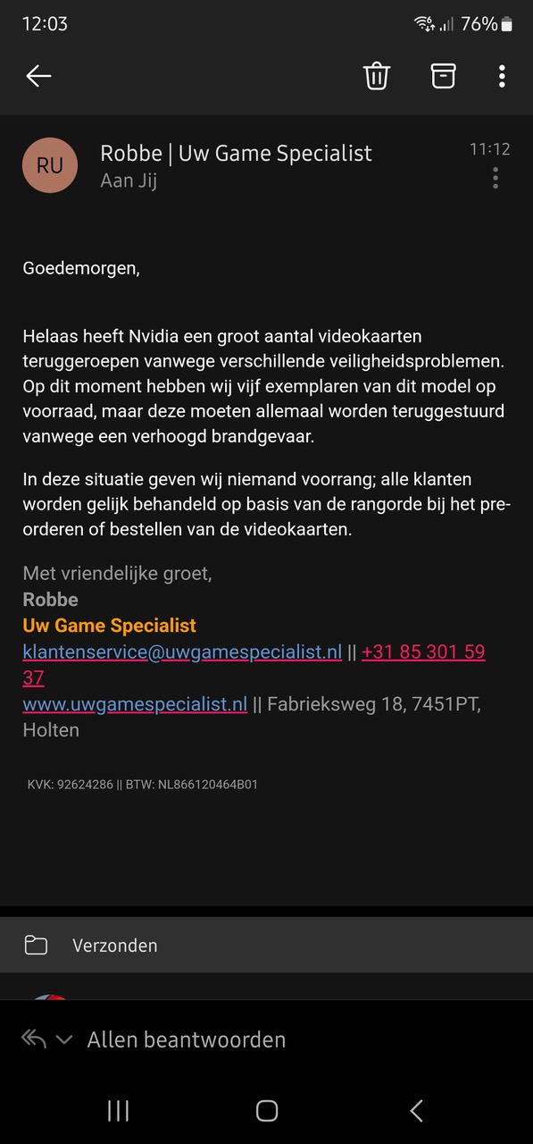 Here is what the retailer email told Ben, their customer, translated from Dutch to English: “Nvidia has recalled a large number of video cards due to various safety issues. We currently have five units of this model in stock, but they all have to be returned due to an increased fire hazard. In this situation, we do not give priority to anyone; all customers are treated equally based on the ranking when pre-ordering or ordering the video cards.”