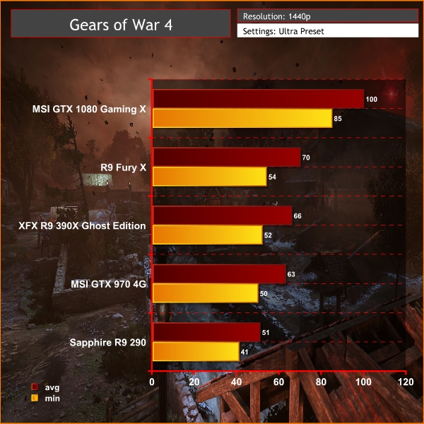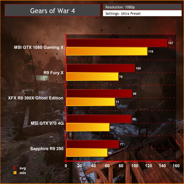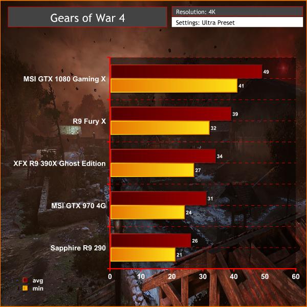 As you can see from our results, Gears of War 4 is a heavily optimised title, especially at 1080p and 1440p. Ultra HD resolutions are still a struggle but I was able to achieve a 64 frames per second average on the GTX 1080 by using high details instead of ultra. The other GPUs in our test today couldn't really come close to that without being dialled down to low settings and even then, only the Fury X managed to break the 60 barrier, while the GTX 970, R9 290 and R9 390x sat in the low 50's.