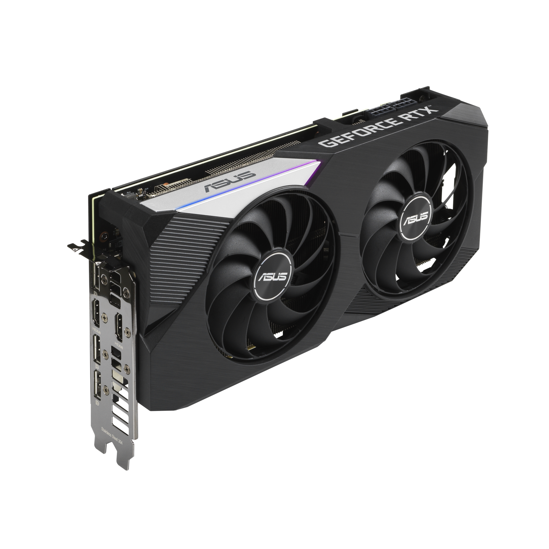 The TUF Gaming series uses another three-fan design, optimised for “reduced turbulence” and features a 0db mode to stop the fans when idling. The GPU and memory have their own heatsinks and as usual for TUF-branded gear, ‘military-grade' components are also touted. Last on the list is the Asus Dual, which aims to deliver the “ampere architecture experience in its purest form” with a clean dual-fan cooling shroud and an aluminium backplate.