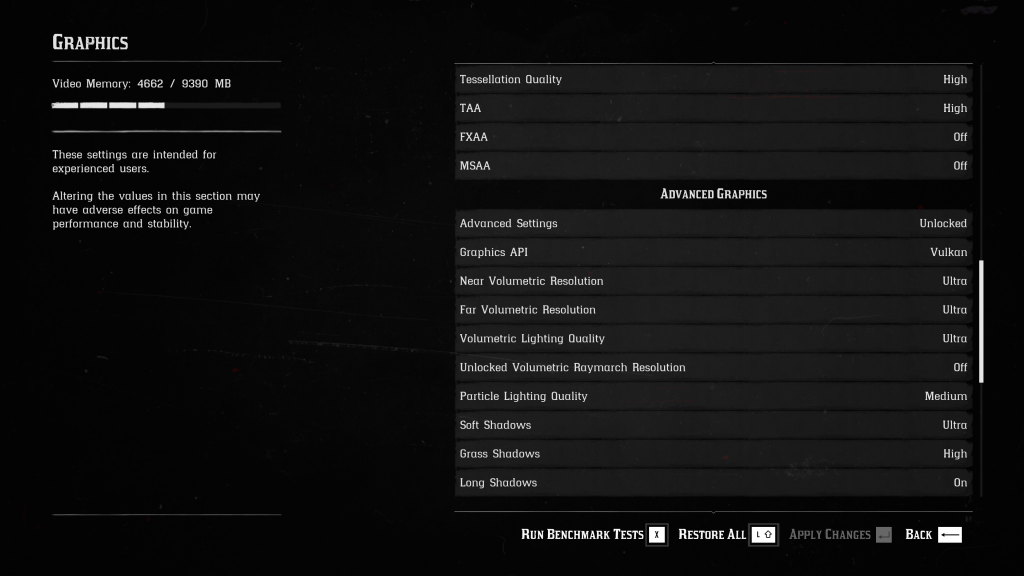 After sitting through the lengthy pre-load decryption process and the additional 3GB day-one patch, we were finally able to launch Red Dead Redemption 2 this afternoon. The game defaults to using the Vulkan API but in the advanced settings menu, you can switch over to DirectX 12 based on preference. If you don't fancy tinkering with all of the individual graphics options yourself, there is a preset slider with 20 different options, so you can slide down for higher performance or up for higher image quality.