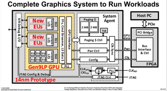 The GPU shown has two chips, the first houses the main GPU and a system agent, while the second has a field programmable gate array (FPGA) that handles the PCI bridge and bus interface. Since this presentation was mainly in place to demonstrate circuit techniques, it does not include information like VRAM, Stream Processors or Compute Units.