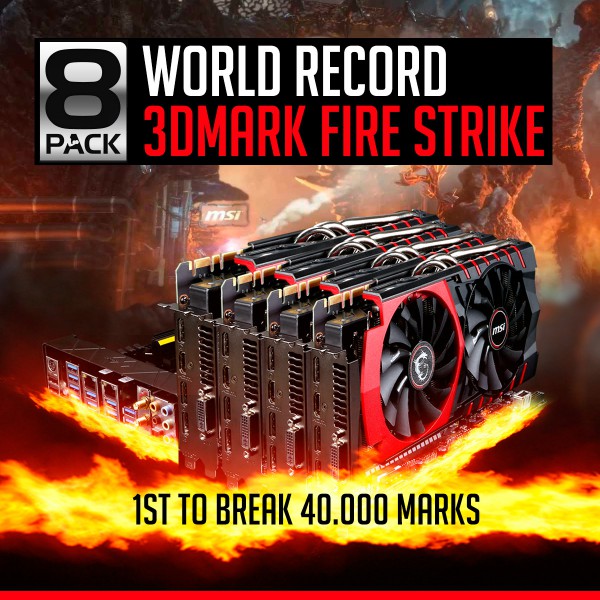 For the second time today we've seen an overclocking world record broken at the MSI MOA overclocking event. This time 8-Pack has managed to break 40,000 marks in 3DMark using the MSI X99S XPower AC motherboard. The new world record 3DMark Fire Strike score is 40052, with help from MSI's motherboard and four MSI Gaming 4G GTX 980 graphics cards.
