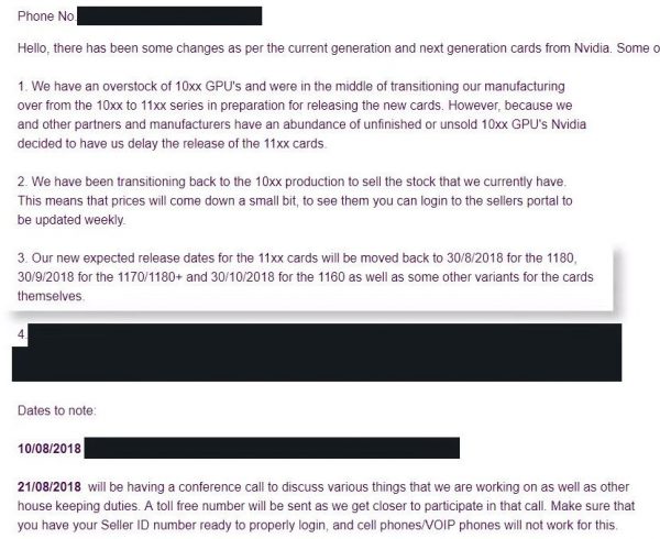 Apparently, a conference call will be held on the 21st of August to brief partners on launch plans. From there, the GTX 1180 will supposedly see the light of day on the 30th of August, with the GTX 1170 scheduled for the 30th of September and the GTX 1160 on the 30th of October.