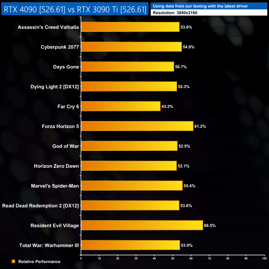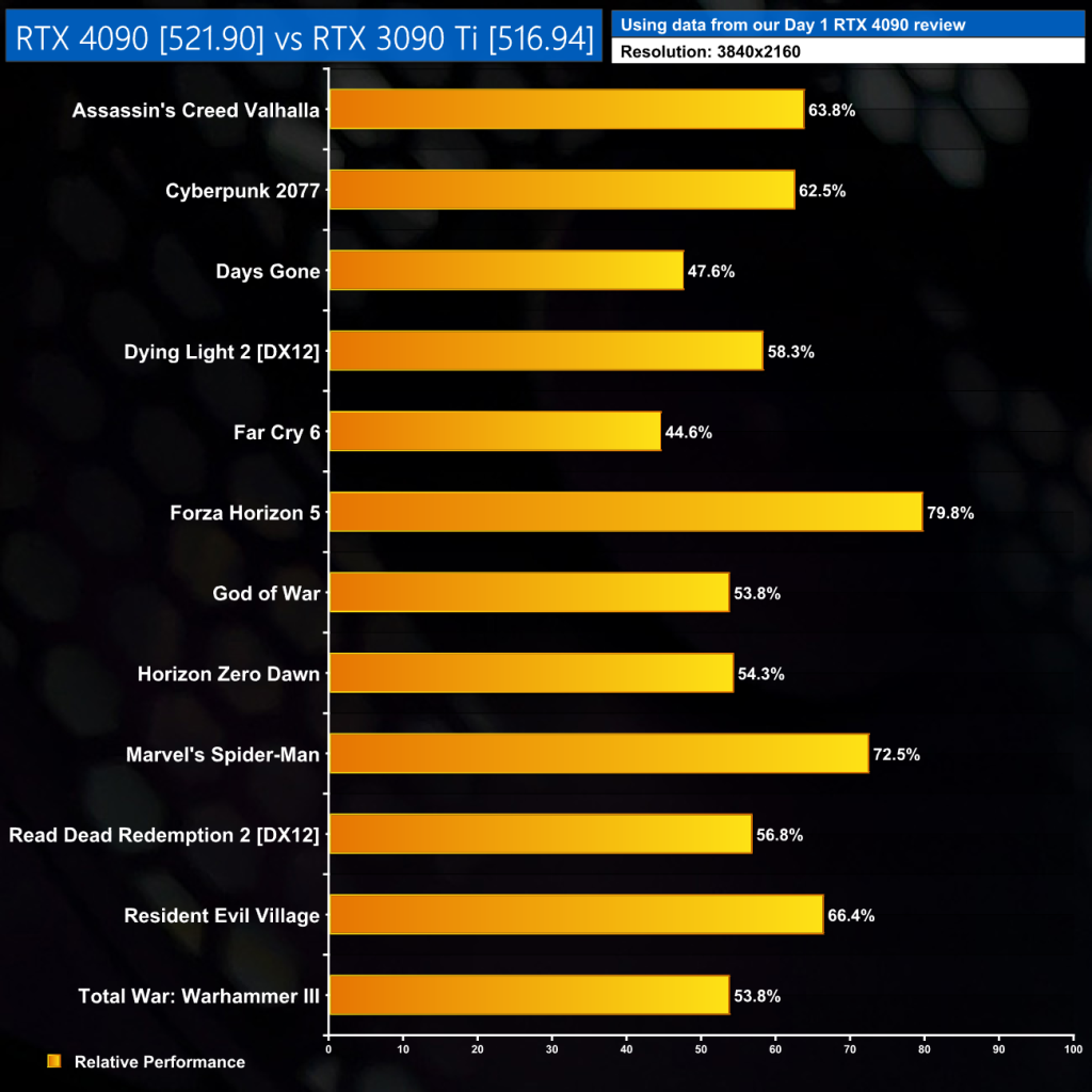 In the charts above, you can see how much the comparison between the RTX 3090 Ti and the RTX 4090 has changed since our launch day 4090 review, using driver version 521.90. The RTX 4090 still blazes past the last-gen card, but the gap has shrunk a bit thanks to additional optimisations introduced for RTX 30 GPUs in newer driver versions. The new card didn't get slower, but older cards definitely got faster.