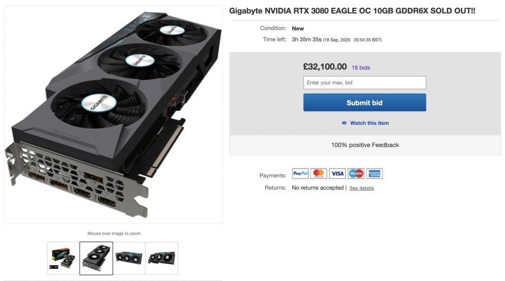 What we do not recommend is going to eBay, as a quick cursory search will show a slew of false bids on RTX 3080s, driving prices up into the £20,000 range or higher.