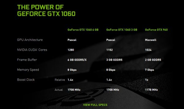 The Nvidia website now lists the GTX 1060 6GB spec with GDDR5/X memory, indicating that an updated SKU is on the way. Memory speed is still listed as 8Gbps but most GDDR5X modules run between 10-12Gbps.