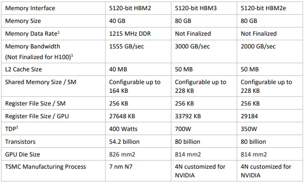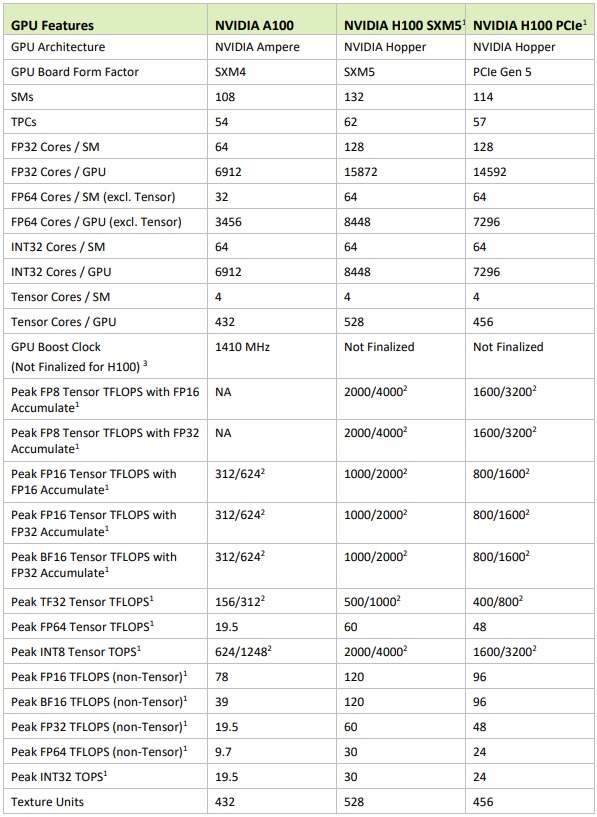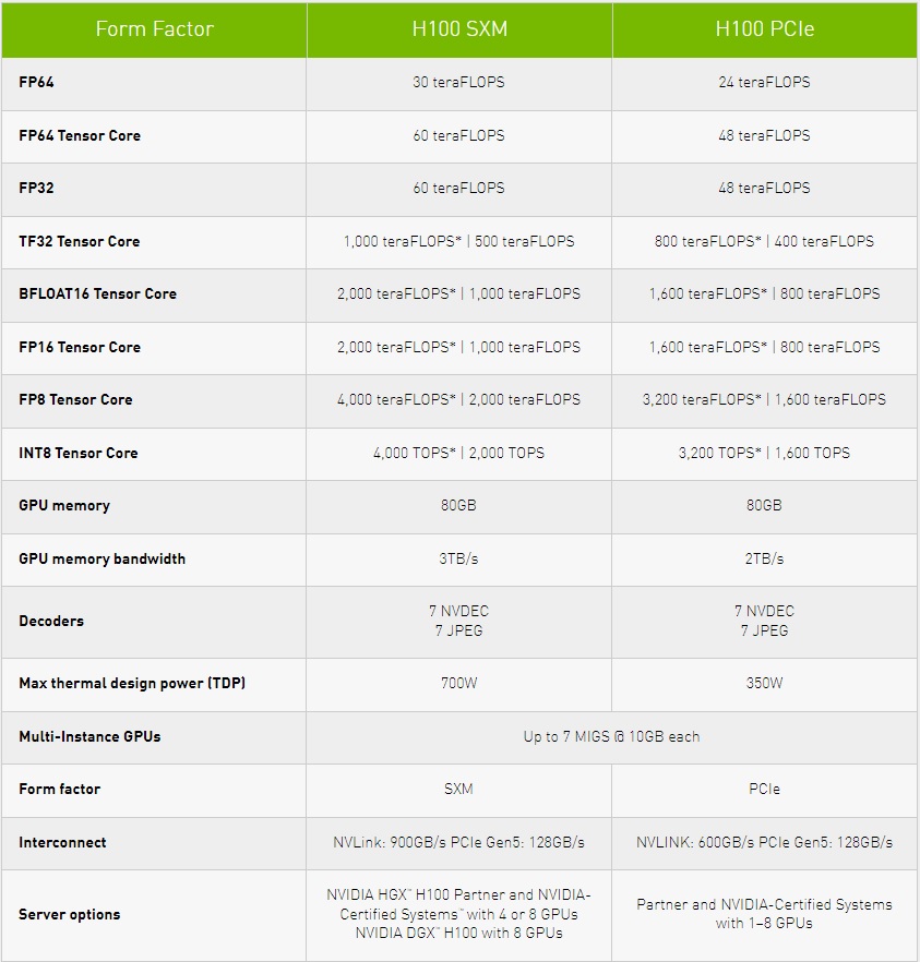 In the gallery above, you can see the full spec sheet for the H100, as well as a page detailing TFLOP, TOPS and FLOPS ratings for different cores. The SXM version is the more powerful of the two, with a 700W TDP, more memory bandwidth and higher performance, the PCIe Gen 5 version has a 350W TDP by comparison.