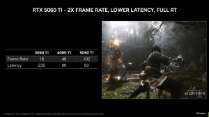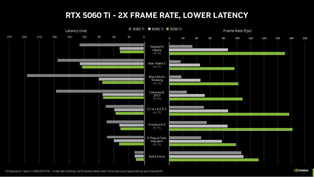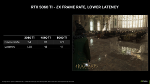 Hogwarts Legacy is another big game tested in Nvidia's benchmarks. According to Nvidia, the RTX 4060 Ti was capable of 87FPS at 1440p with max settings, in addition to DLSS Quality and Frame Generation. On the RTX 5060 Ti with Frame Generation 4x, the frame rate jumps up to over 170FPS.