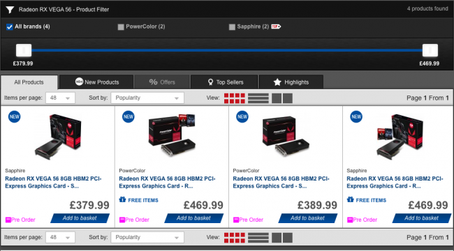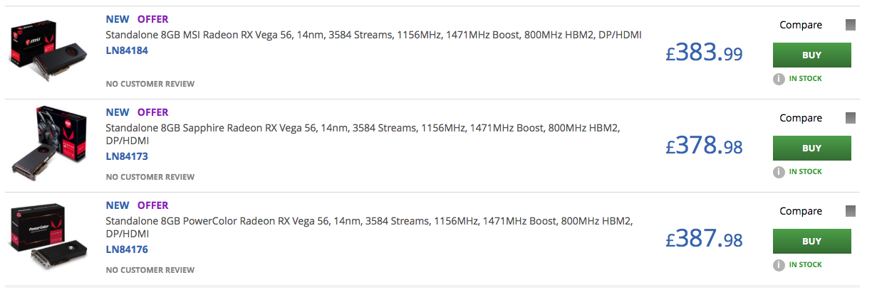 UPDATE (14:10): At the time of writing, SCAN appears to be the only UK retailer with RX Vega 56 in stock. Prices (at the time of publishing) are pretty good, with in-stock models going for around the £380 mark: