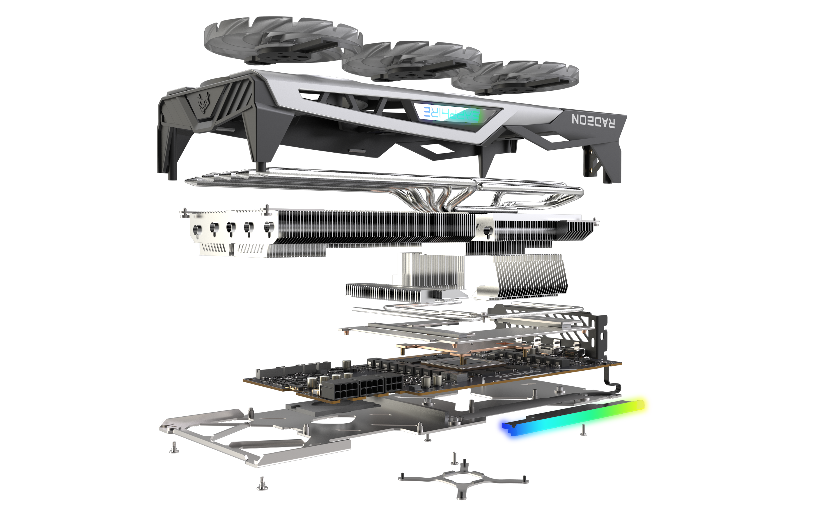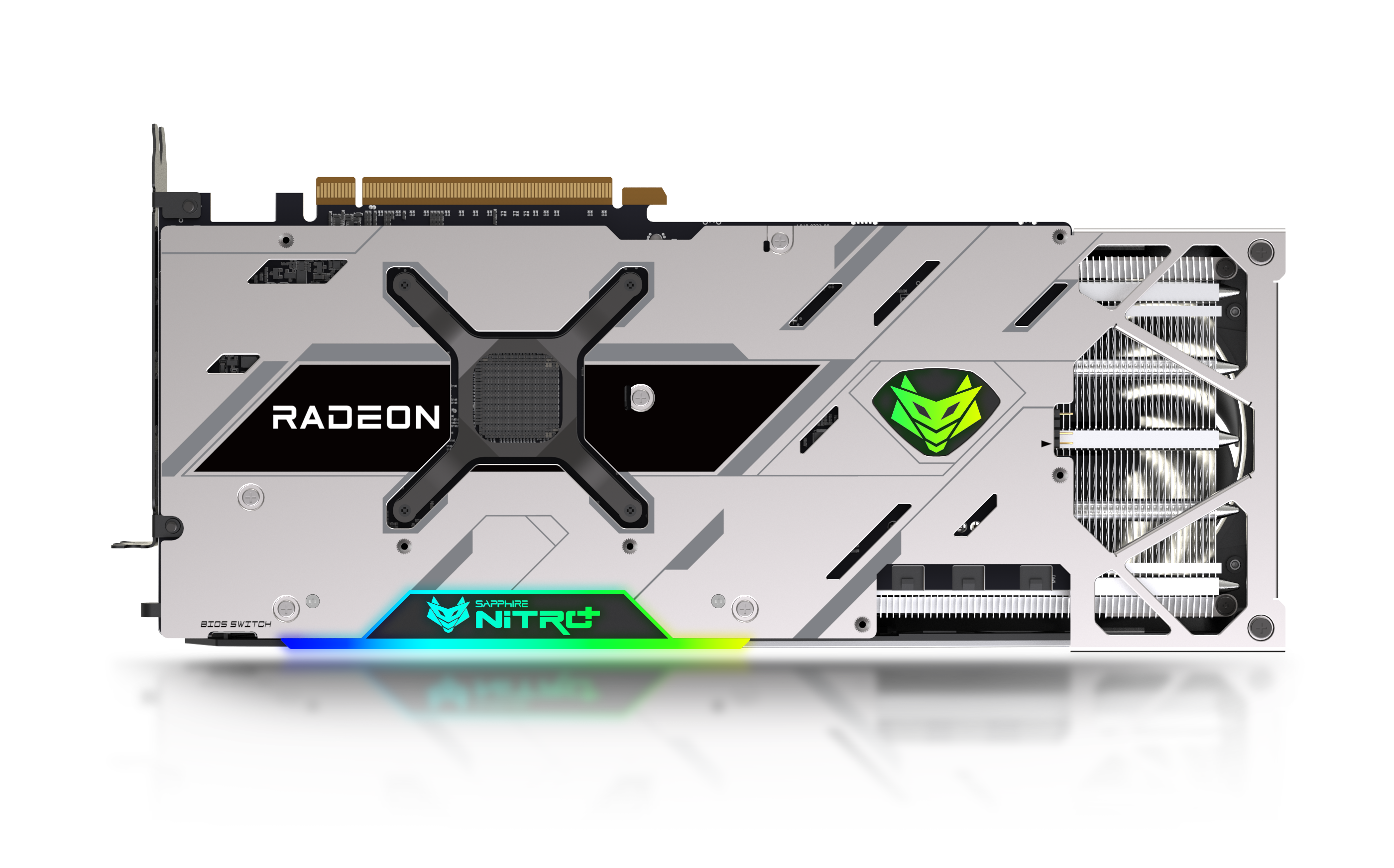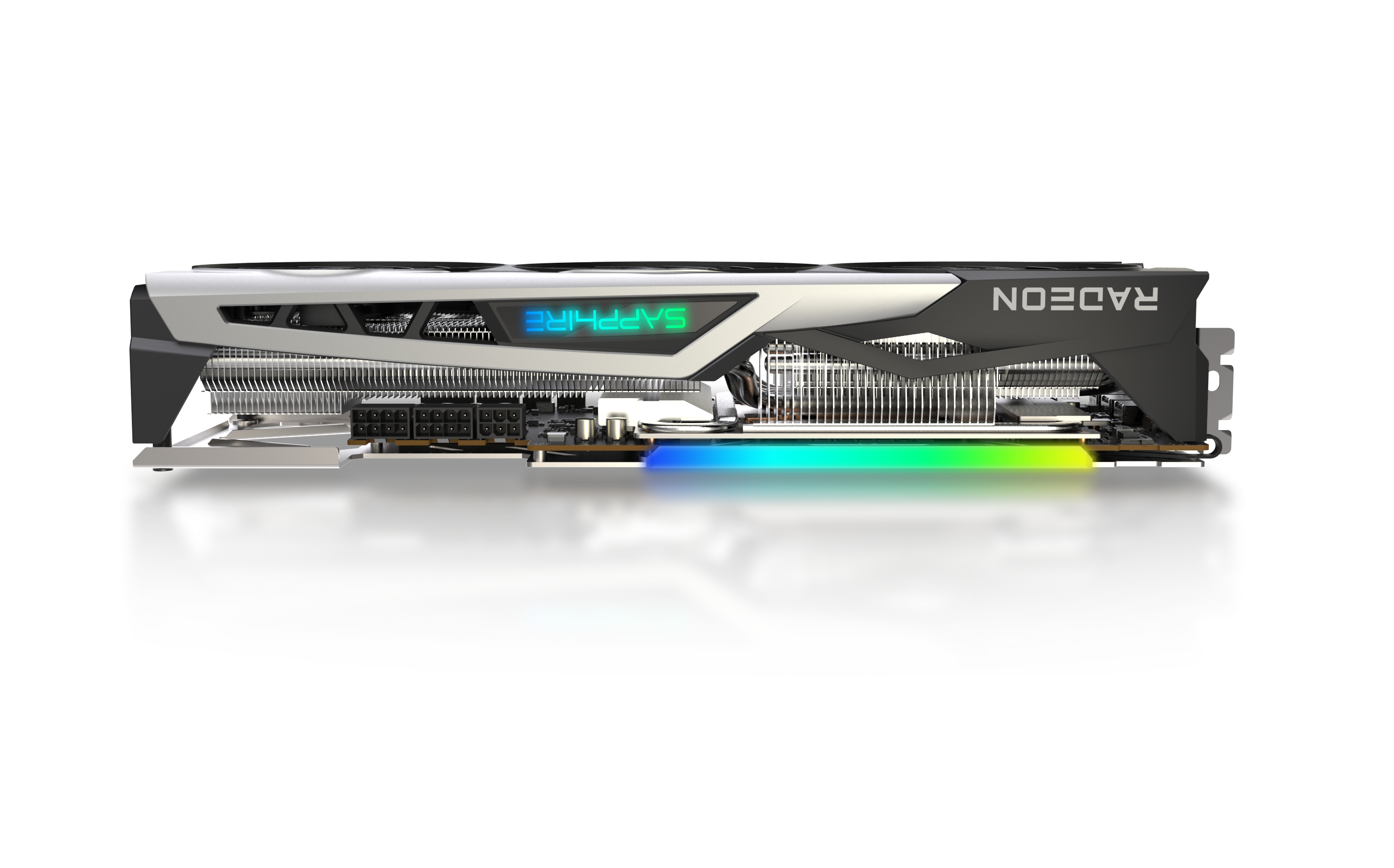 The card of course features plenty of RGB, with LEDs in the fans, cooling shroud and the back of the PCB as well. As you would expect, the GPU also comes with several classic Sapphire features, including Intelligent Fan Control, Precision Fan Control, TriXX Software BIOS switch and TriXX Boost for further performance enhancements.
