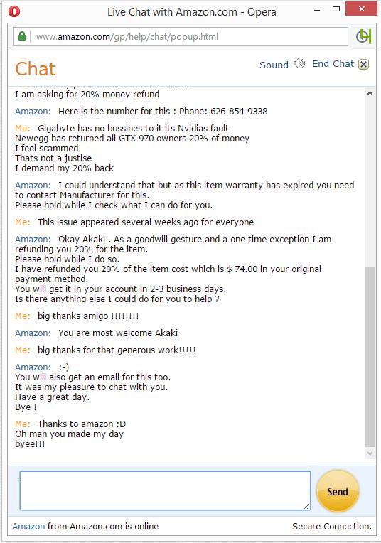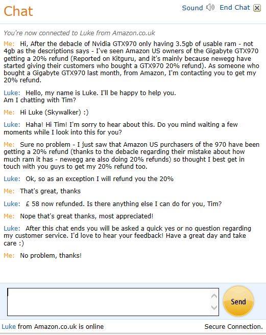 Two readers, Tim Spencer and Akaki Mukhigulashvili, sent in chat logs with Amazon customer service, who after a little persuading, agreed to issue 20 per cent refunds on the GTX 970 purchase as a ‘one time exception'. Amazon customer service is usually pretty good and in this case, they are being very generous. These refunds follow on from US retailer, Newegg, which also agreed to give 20 per cent refunds to those that bought a GTX 970.