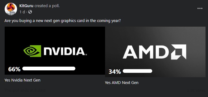 We ran this particular poll over on our Facebook page. Out of the 3,000 votes, two thirds of them went towards buying a next-gen Nvidia graphics card, with the remaining 1,000 votes going to AMD.