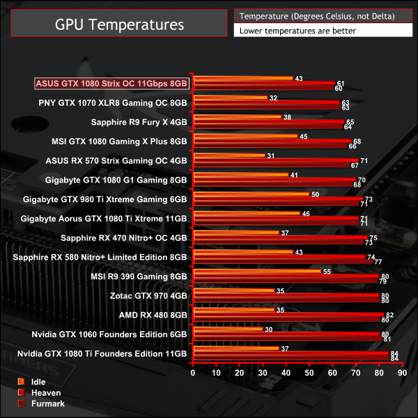 GPU core temperatures were stupendously good and given that the ASUS card is slightly louder than its rivals it would make sense for ASUS to slacken off the default fan profile in favour of lower noise.