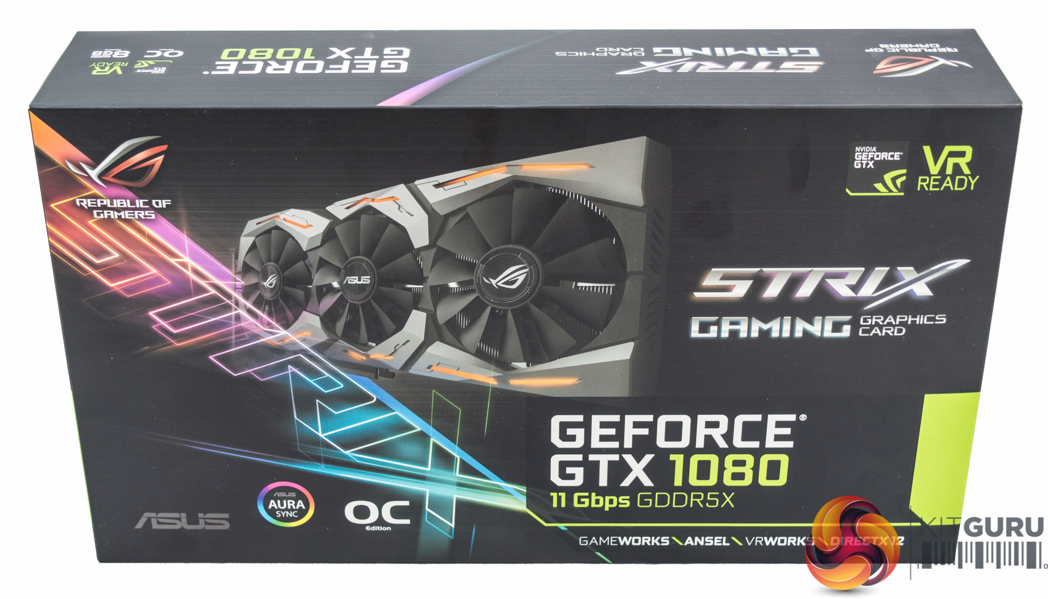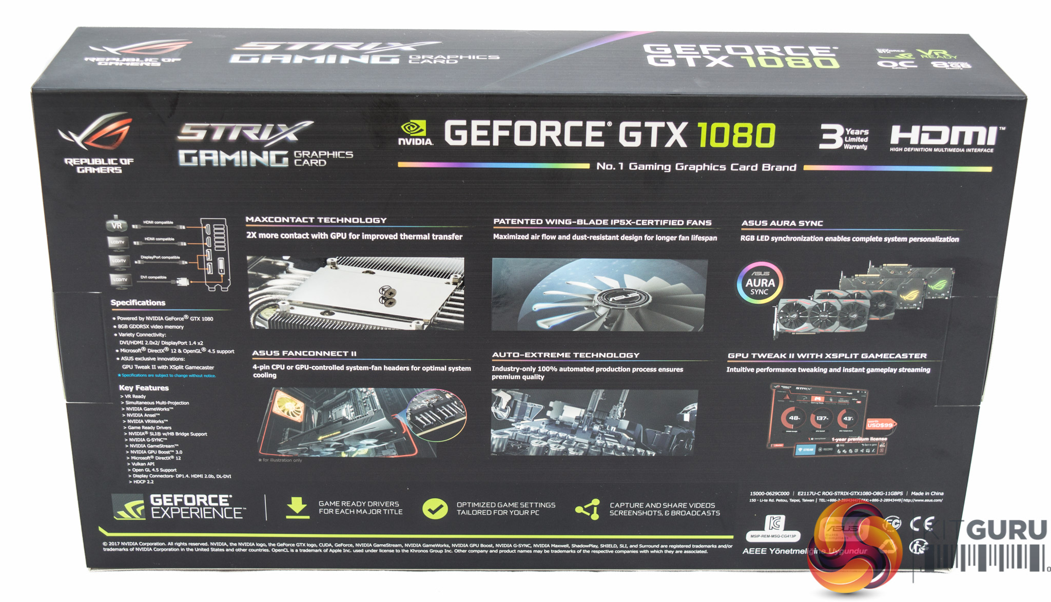 Packaging for the ASUS GTX 1080 ROG Strix OC 11Gbps is well-presented and gives a concise overview of the product's key features including a nickel-plated contact plate for the cooler, IP5X-certified fans, ASUS Fan Connect II, AURA RGB and Auto Extreme.