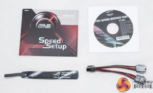 The accessory bundle includes a speed setup guide, driver and utility CD, two ROG cable ties and a dual 6pin to single 8pin PCIe power cable adapter.