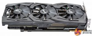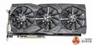 The triple-fan design is prominent and should give ASUS an airflow advantage over the dual-fan design of the MSI GTX 1080 Gaming X Plus. Like virtually all graphics cards in this segment the GPU fans switch off when the temperature is below a temperature of around 55-60 degrees Celsius.