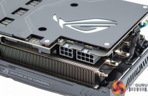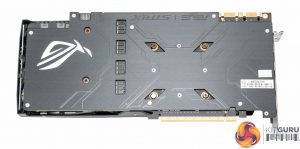 ASUS equips a backplate but it's not full cover as it has cut-outs at various locations including the backs of the VRM components and a 6pin PCIe solder point that isn't used, which looks a little untidy. There is, however, an ROG logo which is included in the RGB LED setup for nifty lighting effects.