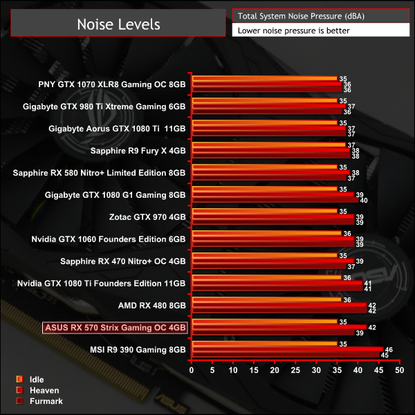 The underlying noise level of the system, emitted by all the non-GPU hardware combined, is 35 dBa thus anything above this level can be attributed to the graphics cards. The PSU is passive for the entire power output range we tested all graphics cards in and all CPU and System fans have a fixed fan speed completely isolating them from any changes in temperature across the system.
