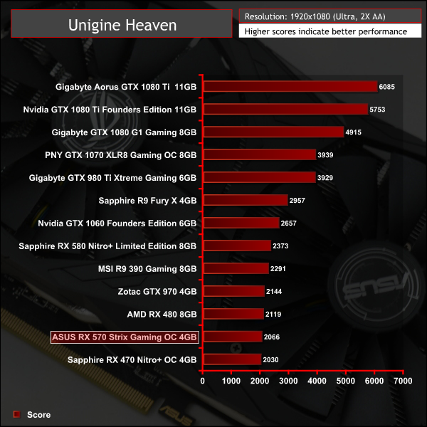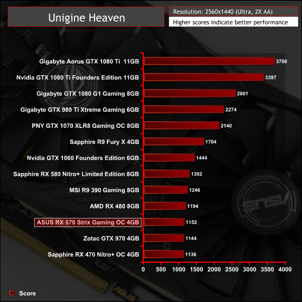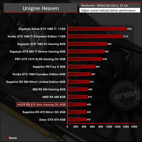 In Unigine Heaven this ASUS RX 570 is roughly equal to a stock GTX 970.