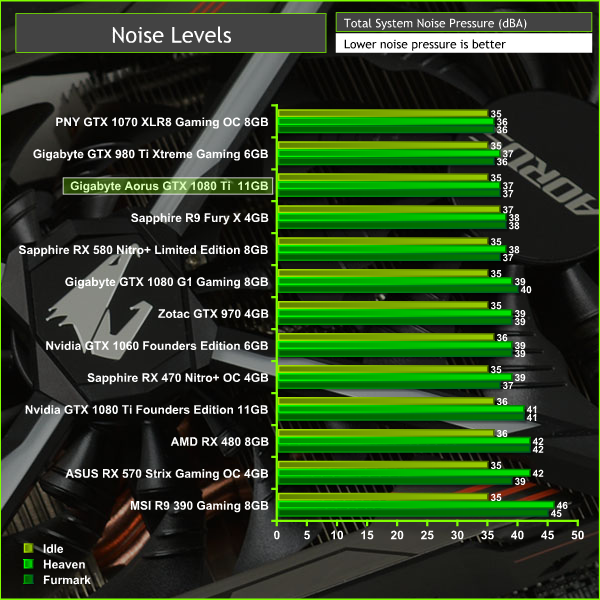 Noise levels were measured after 5 minutes of load under three scenario: Furmark, Unigine Heaven and desktop idle in sequential order with 2 minutes downtime in between each test.