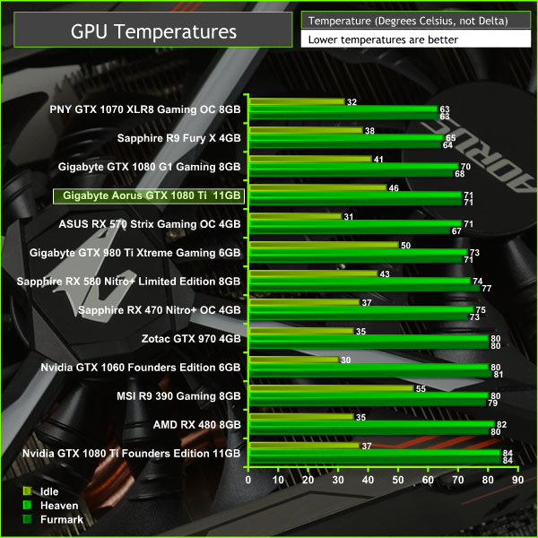 Temperatures were measured after 5 minutes of load under three scenario: Furmark, Unigine Heaven and desktop idle in sequential order with 2 minutes of downtime in between each test. GPU-Z was used to record the maximum temperature, fan profiles on GPUs were left to their default behaviour.