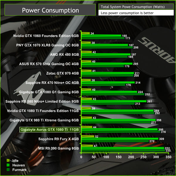 Power consumption jumped only by 25 watts for the Gigabyte card over Nvidia's reference card but push those clocks further, such as by enabling Gigabyte's OC mode, and it starts to increase into the mid-300 region.