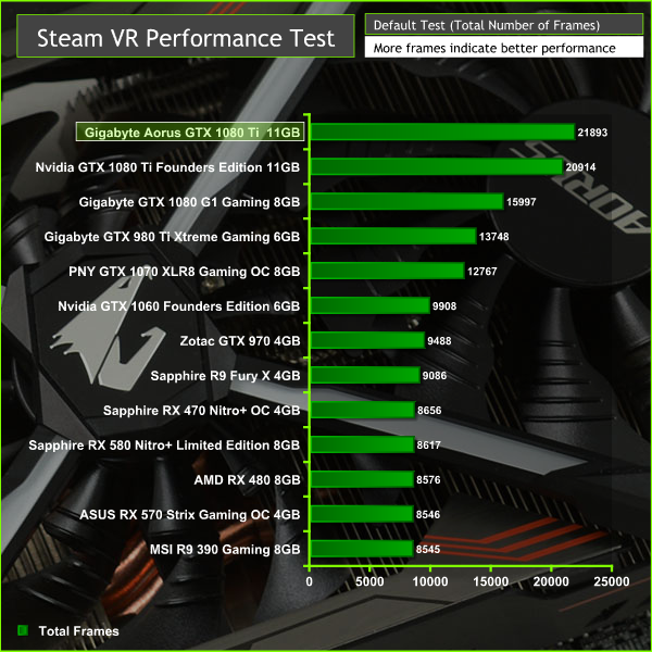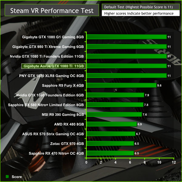 It's not possible to score more than 11 in the Steam VR Test so the Aorus GTX 1080 Ti claims the top score.