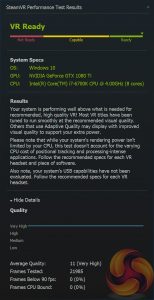 The SteamVR Performance Test measures a system's rendering power using a 2-minute sequence from Valves Aperture Robot Repair VR demo. After collecting the data it determines whether a system is capable of running VR content at 90fps and whether VR content can tune the visual fidelity up to the recommended level. For machines that are not VR Ready the tool can help determine whether capabilities are bound by Graphics Card, CPU, or both.