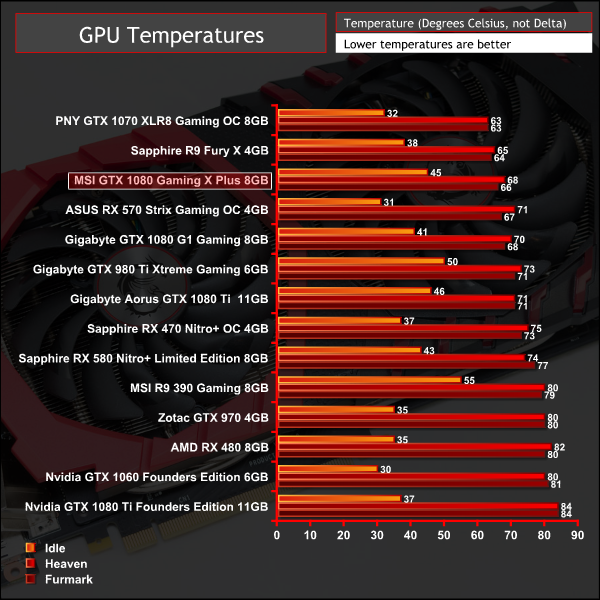 Temperatures were measured after 5 minutes of load under three scenario: Furmark, Unigine Heaven and desktop idle in sequential order with 2 minutes of downtime in between each test. GPU-Z was used to record the maximum temperature, fan profiles on GPUs were left to their default behaviour.