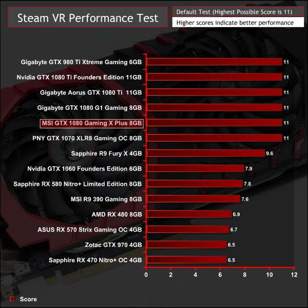 Steam VR test has a maximum score of 11 and the MSI GTX 1080 easily achieves this.
