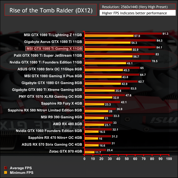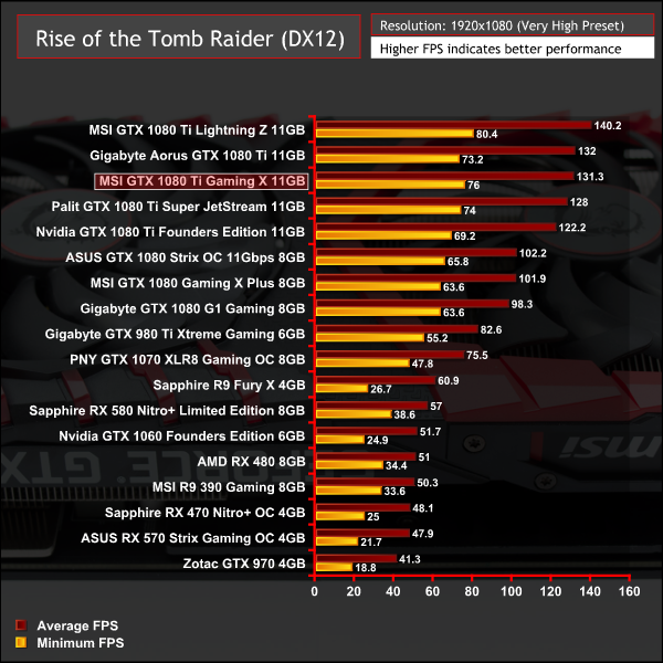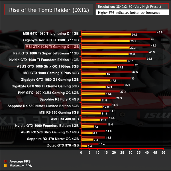 Another expected result in Rise of the Tomb Raider, the MSI Gaming X is slightly faster than Palit's Super JetStream offering.