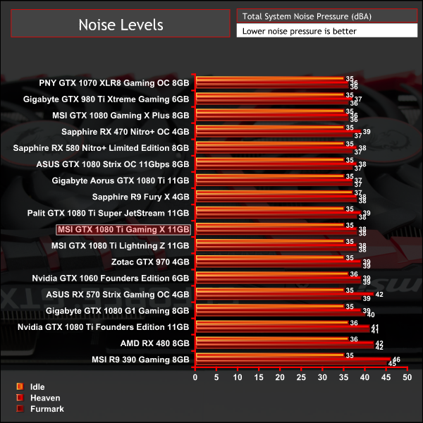 Noise levels were impressive and align with other GTX 1080 Ti graphics cards using custom coolers. There is a sizeable reduction in noise compared to the Founders Edition card.