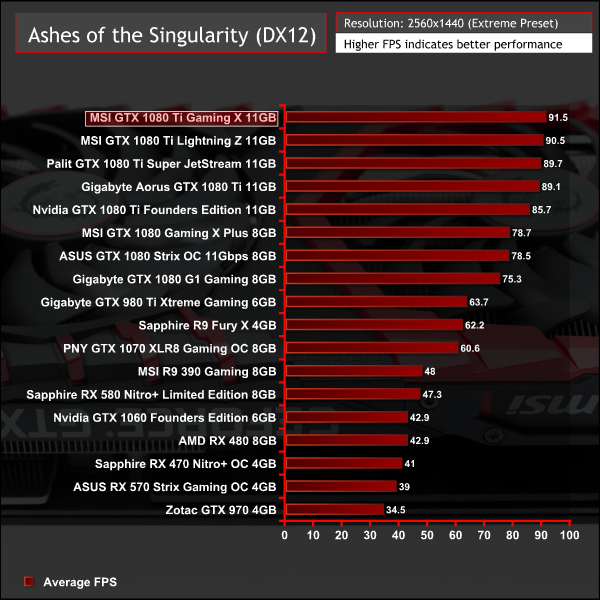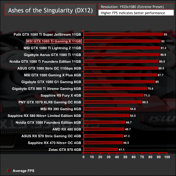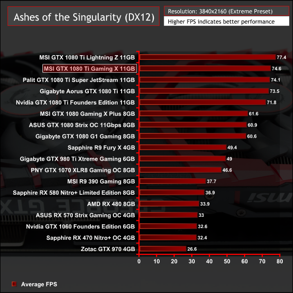 Ashes of the Singularity seems to be somewhat variable at lower resolutions but all GTX 1080 Ti graphics cards cluster within a few frames of each other.