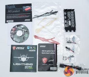 MSI bundles the graphics card with an alternative triple slot I/O shield, three voltage read-off cables for the corresponding headers, a 6 pin to 8 pin adapter cable, some documentation, a driver DVD and a set of decal strips if you don't like the default silver colour. Strangely enough “lightning-style” yellow is not one of the optional colours – there is red, black and gold.