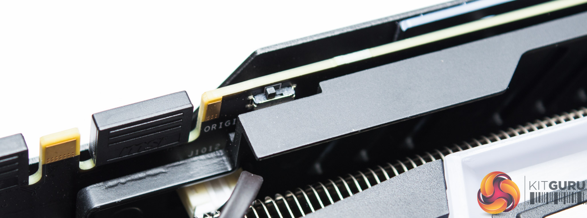 Just to the right of the SLI connections is the vBIOS switch which toggles between a standard mode and an LN2 mode. By toggling the DIP switch to LN2 mode it removes power, current (amperage) and thermal restrictions on the GPU.