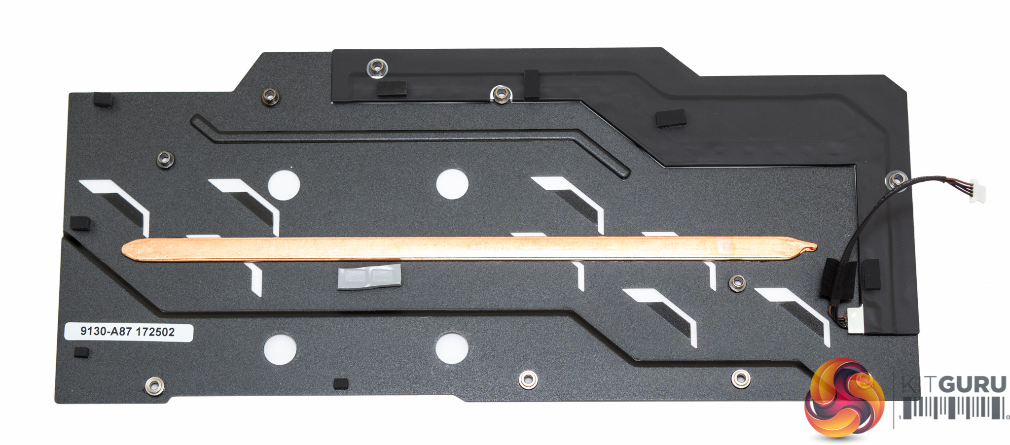 A close up on the backplate reveals it quite literally is a single copper heat pipe spread across the length. It makes direct contact PCB components to provide additional cooling capability.