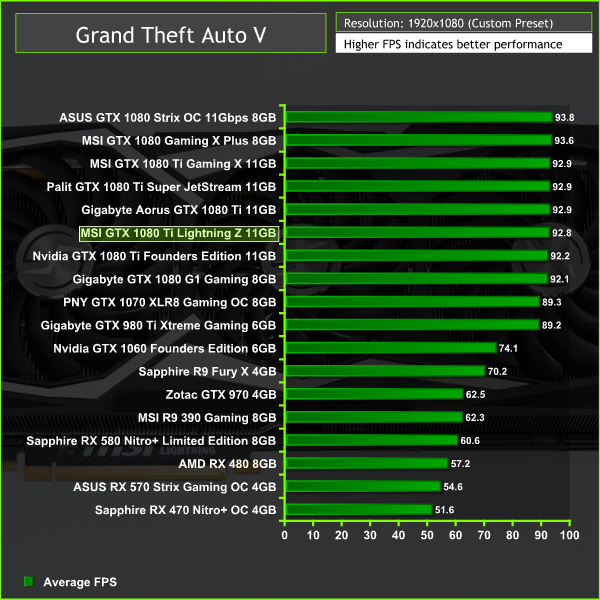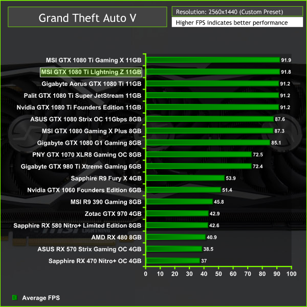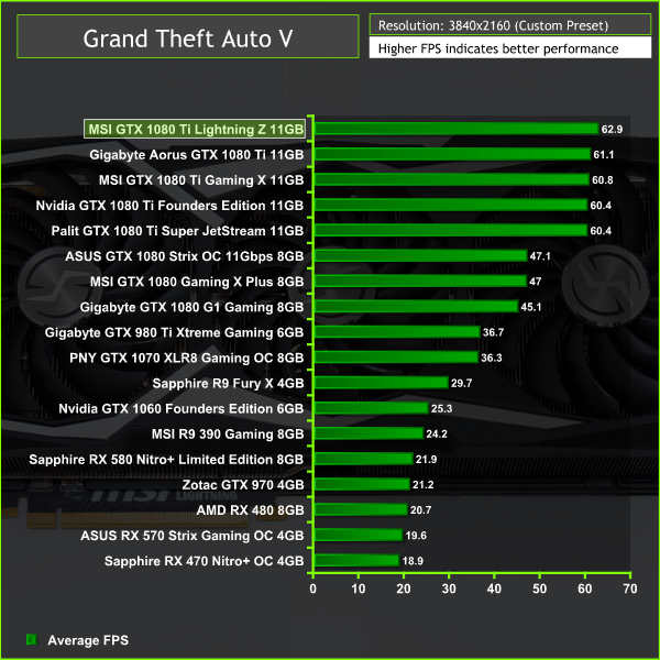 GTA V shows limited variation between GTX 1080 Ti graphics cards at all resolutions.