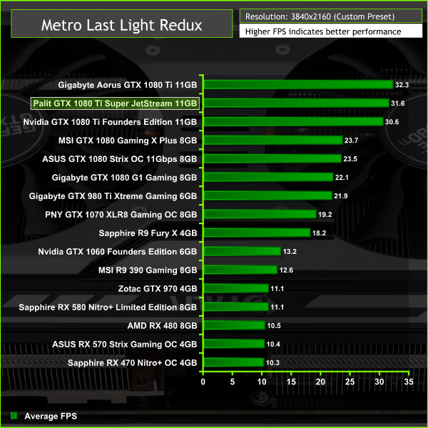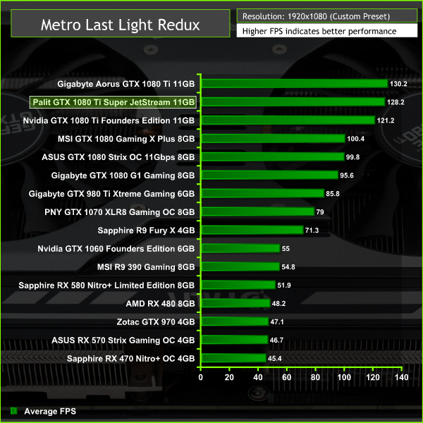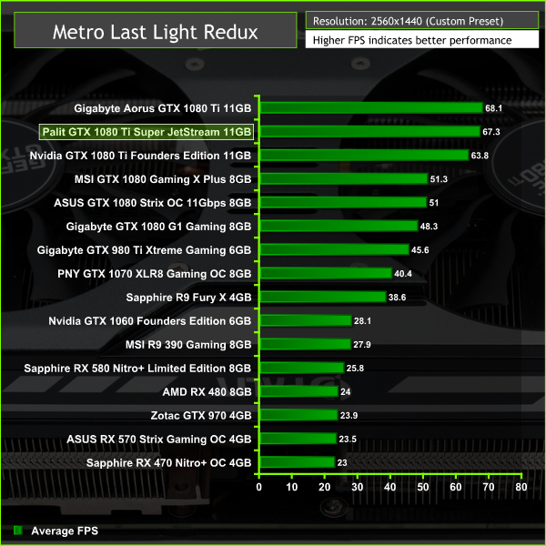Metro Last Light scales the neatest of all games and the Palit card sits right where we would expect given its frequency.
