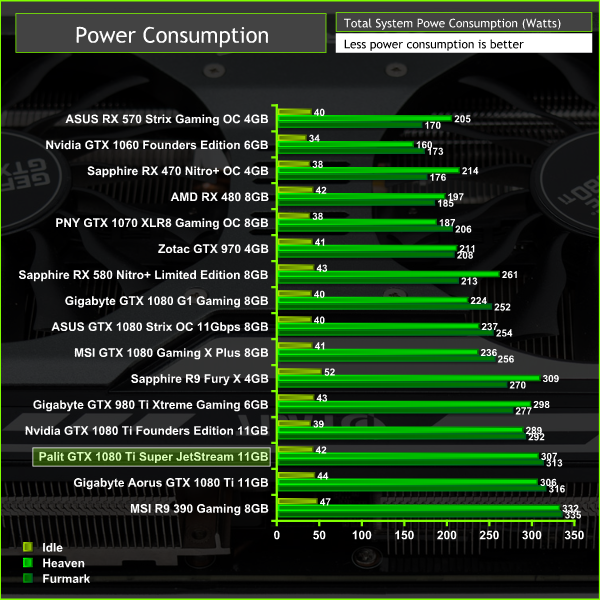 Power consumption was measured after 5 minutes of load under three scenario: Furmark, Unigine Heaven and desktop idle in sequential order with 2 minutes of downtime in between each test. The measurement was taking using an Energenie ENER007 power meter and measured for the whole system at the power supply, excluding the monitor.