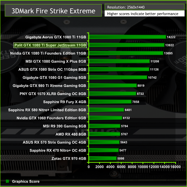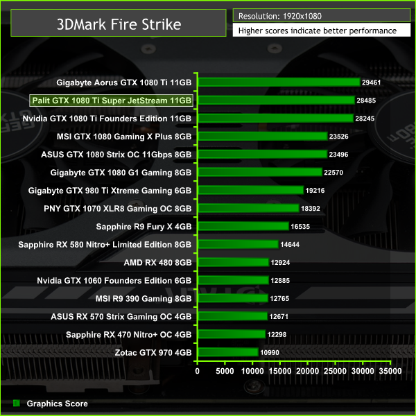 3DMark shows the Palit Super JetStream to be surprisingly close to the Gigabyte Aorus GTX 1080 Ti, despite the large clock speed differences (1671MHz Boost Palit, 1721MHz Boost Gigabyte).