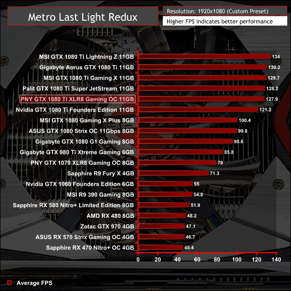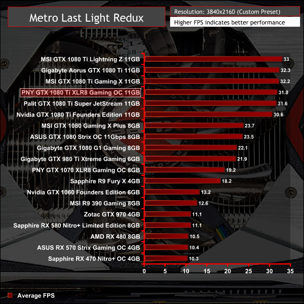 Metro Last Light scales neatly and so the PNY card falls slightly behind the Palit card which is clocked marginally higher. Full details on the clock speed configurations of all benchmarked GPUs is available on the Testing Methodology page.