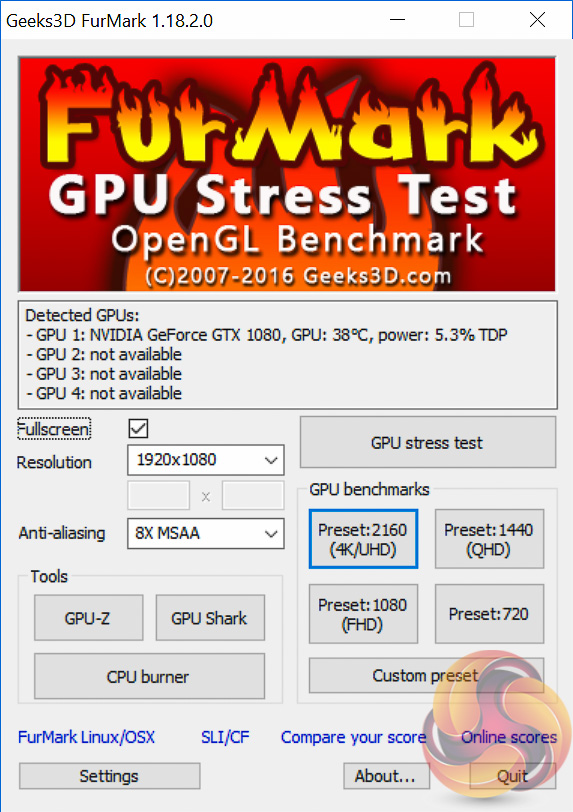 Power consumption was measured after 5 minutes of load under three scenario: Furmark, Unigine Heaven and desktop idle in sequential order with 2 minutes of downtime in between each test. The measurement was taking using an Energenie ENER007 power meter and measured for the whole system at the power supply, excluding the monitor.