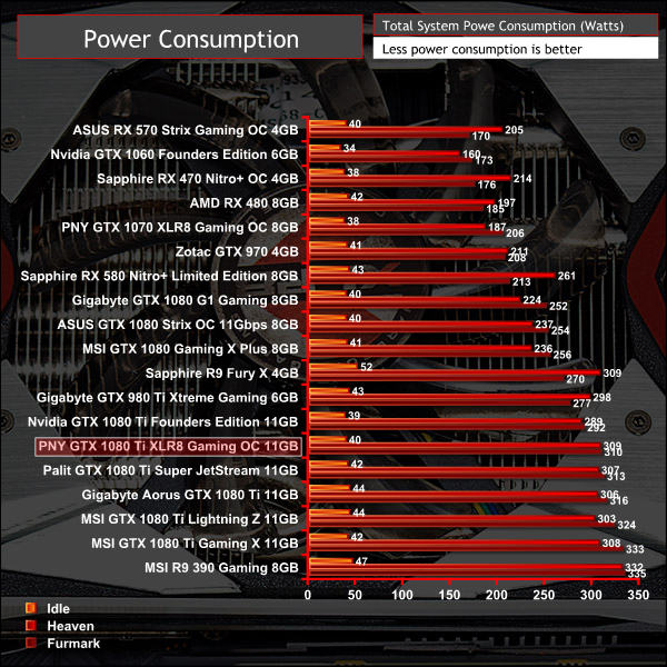 Power consumption was typical of a GTX 1080 Ti of this frequency. PNY's factory overclock increases the card's TDP by about 20-watts over the Founders Edition.