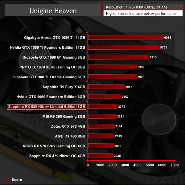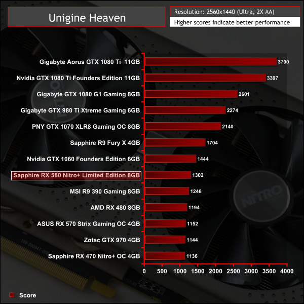 Unigine Heaven, even with tessellation disabled, is tessellation heavy and so favours Nvidia GPUs. The Sapphire RX 580 Nitro+ LE is approximately 10% behind the stock GTX 1060 in this benchmark and around 10% ahead of the RX 480.
