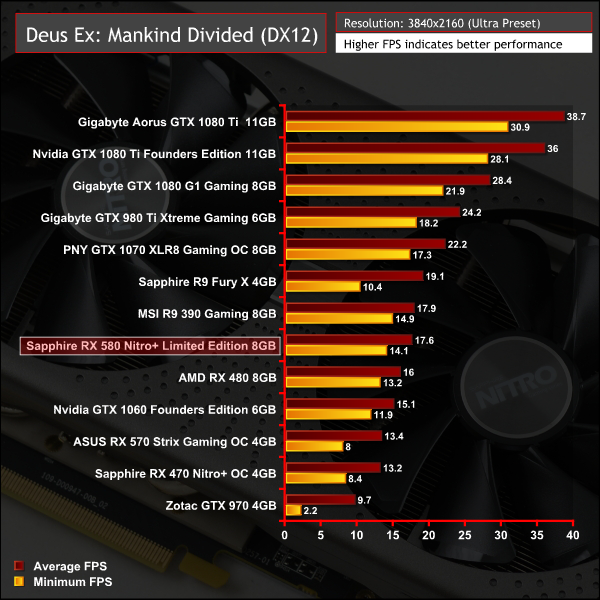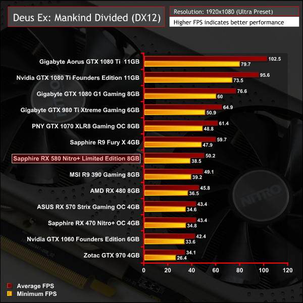 Deus Ex is an AMD-endorsed title so AMD GPUs fare slightly better here. The RX 580's improvement over the RX 480 here is around 10%.
