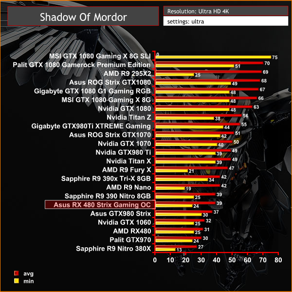 The Asus RX 480 Strix Gaming OC averages 39 frames per second, placing it in direct competition against the Sapphire R9 390 Nitro 8GB.